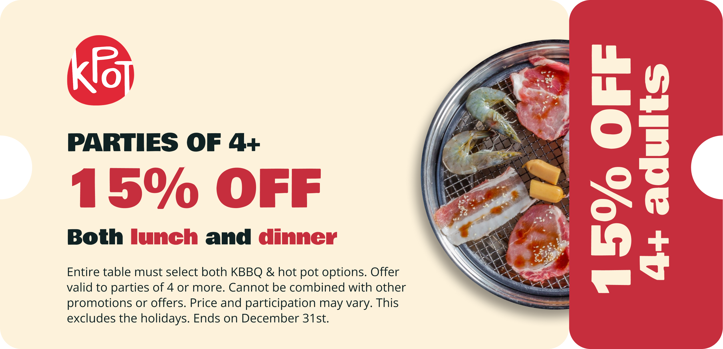 Bring the whole crew together and enjoy an unforgettable dining experience with our Parties of 4+ Special at KPOT Korean BBQ & Hot Pot in Rockville. Whether you’re planning a family meal, a friends’ night out, or a small celebration, groups of four or more can take advantage of this exclusive promotion.